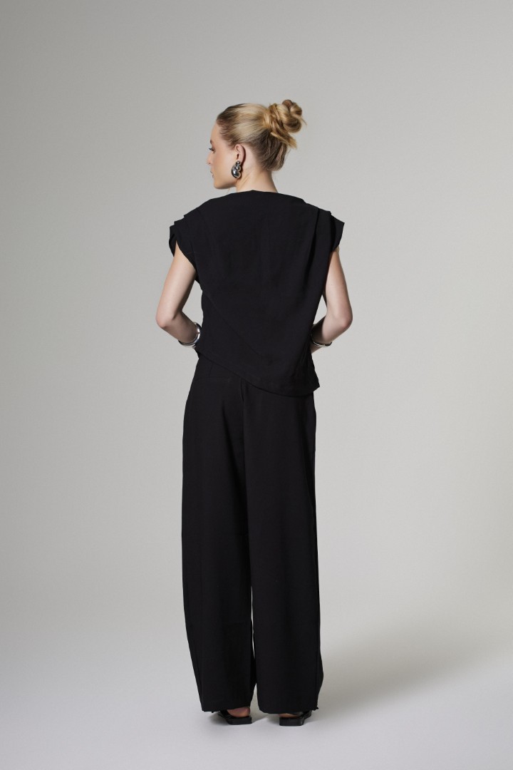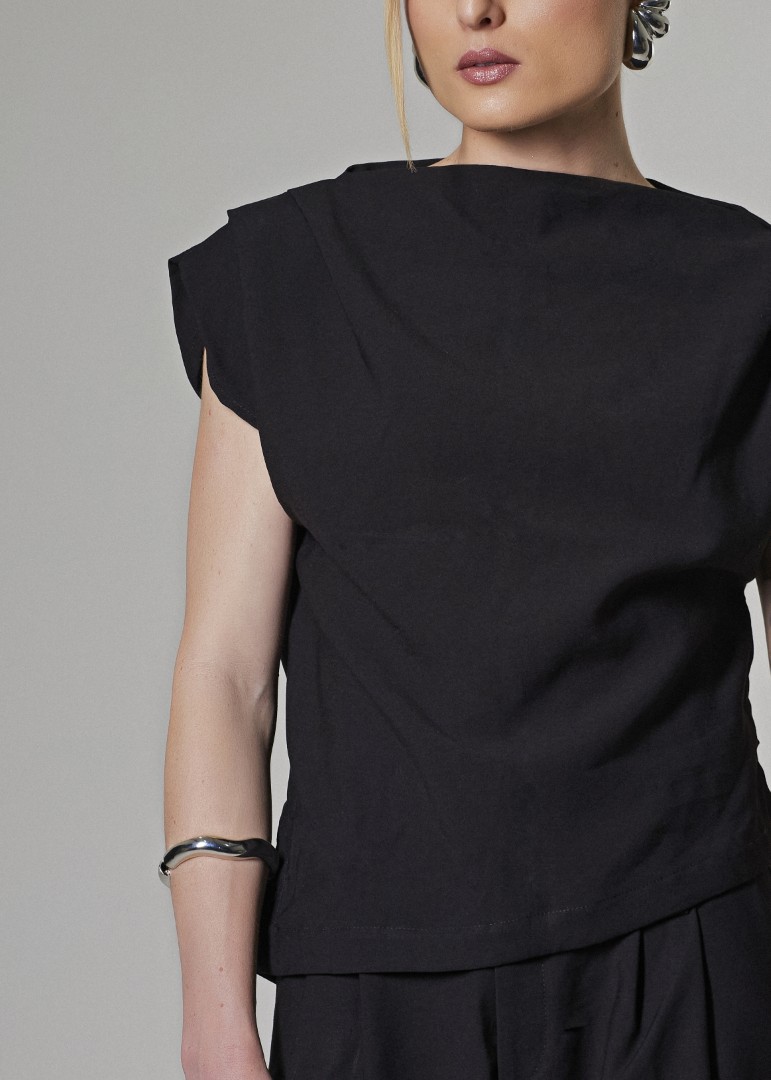Blusa em alfaiataria, com corte mais solto, barra levemente assimétrica com pequenas fendas nas laterais. Detalhe único de pregas acima dos ombros que tornam essa blusa mais única e especial, decote fechado com corte reto e manguinha estilo regata que avançam acima dos braços, trazendo mais estilo a peça.