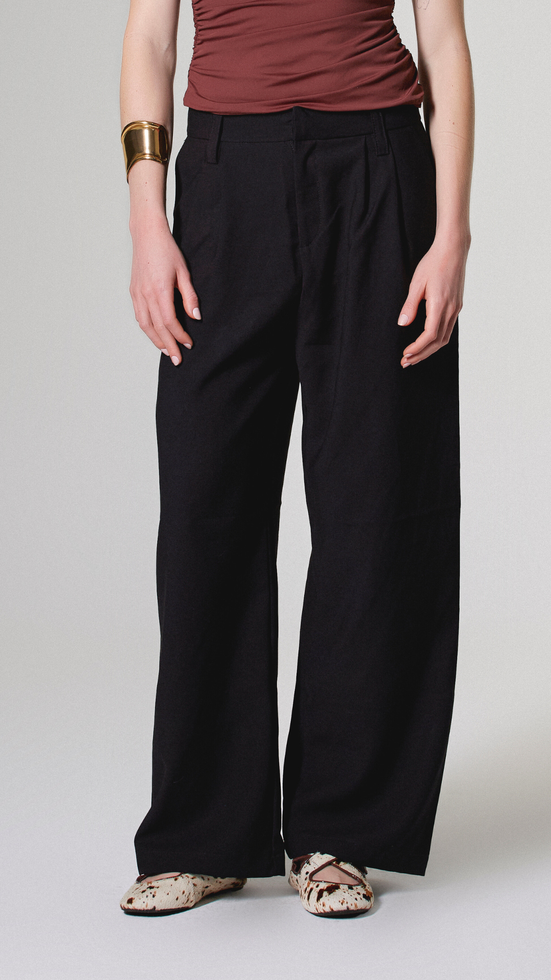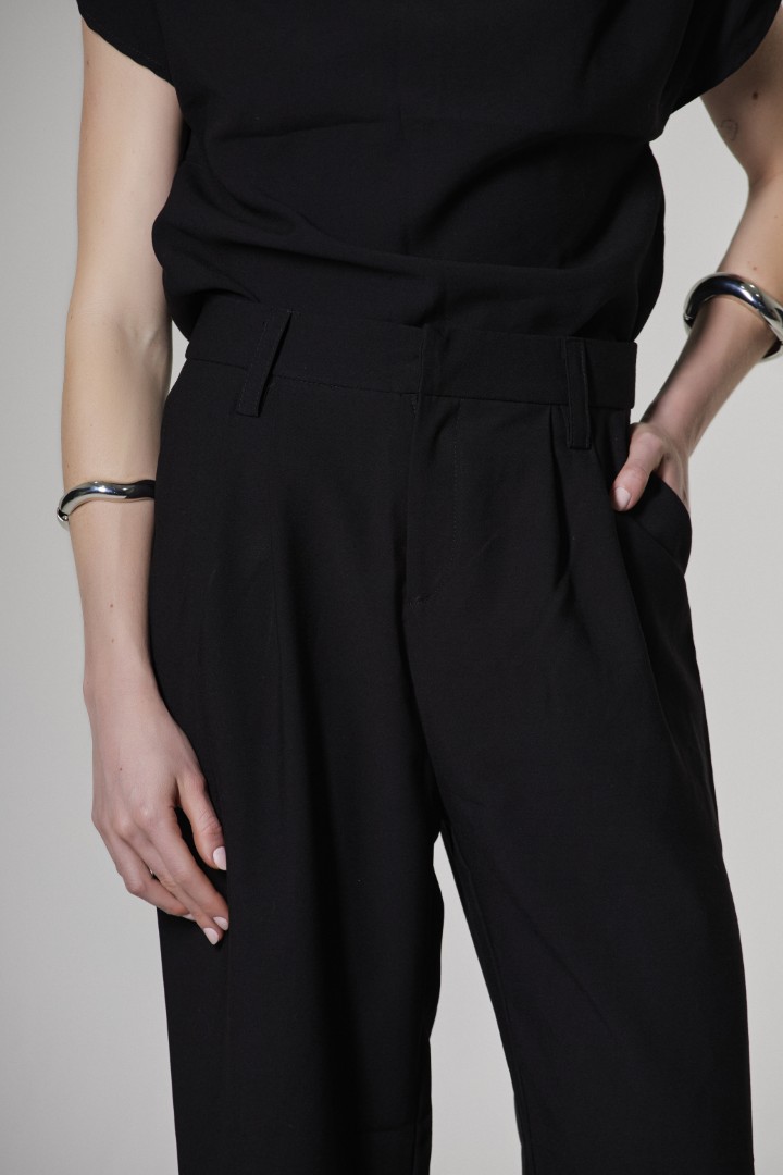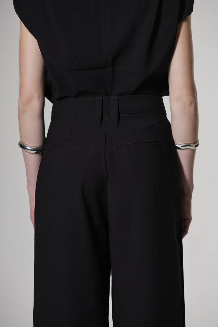 Calça em alfaiataria com modelagem reta, mais ampla e comprimento longo. Modelagem cintura média, podendo ser usada tanto baixa quanto mais alta. Bolsos estilo faca e pregas frontais que valorizam o caimento. Possui com cós clássico de alfaiataria, fechamento frontal com ganchos e ziper, garantindo elegância e sofisticação. E bolsos fake clássicos de alfaiataria na parte de trás.