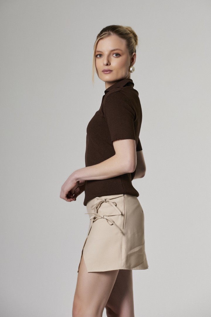Mini saia em alfaiataria, com frente transpassada e detalhe de amarração na lateral trazendo um toque romântico para a peça, fechamento feito na lateral por zíper invisível embutido. Parte de trás reta lisa, e shortinho de forro na parte de dentro.